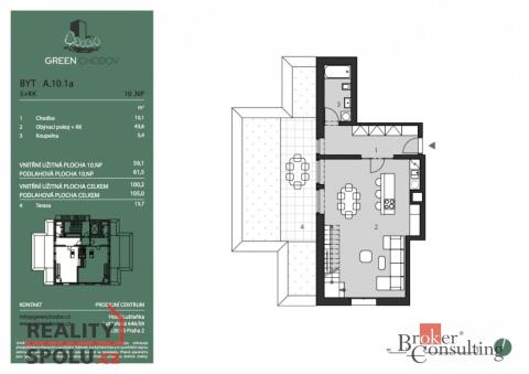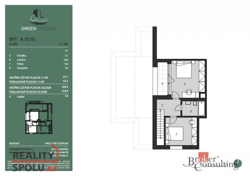 Představujeme vám jedinečnou nemovitost v nově vznikajícím rezidenčním projektu Green Chodov. Moderní architektura, vysoký standard a atraktivní lokalita dělají z Green Chodova místo, kde se propojuje komfortní městský život s klidem přírody – ideální jak pro vlastní bydlení, tak i pro bezpečnou investici. Tento luxusní mezonetový byt 3+kk zaujímá nejvyšší dvě podlaží jedenáctipatrového domu a nabízí promyšlené dispoziční řešení s důrazem na prostor, světlo a nadčasový design. Standard odpovídající exkluzivitě bytu - Třívrstvá dřevěná podlaha - Klimatizace a rekuperace vzduchu – součástí ceny Předokenní žaluzie pro dokonalé stínění a soukromí Výška stropů 2,8 m v ložnicové části – pocit prostoru a vzdušnosti Byt vyniká panoramatickým výhledem na Prahu a dvojicí venkovních prostor: Terasa v 10. patře s přístupem z obývacího pokoje Lodžie v 11. patře přístupná z hlavní ložnice Dispozice celková podlahová plocha: 105 m² terasa: 16 m² lodžie: 6 m² sklep: 2,3 m² garážové stání - je třeba dokoupit za 950 000 Kč. Projekt se nachází v bezprostřední blízkosti metra Chodov, obchodního centra Westfield, sportovišť a parku Trojmezí – ideální rovnováha mezi městem a přírodou. Projekt Green Chodov byl nominován na Realitní projekt roku 2025, což potvrzuje jeho kvalitu, architektonickou úroveň a výjimečnost.