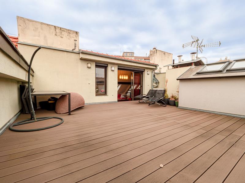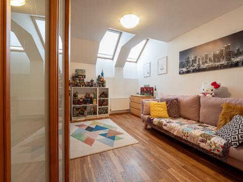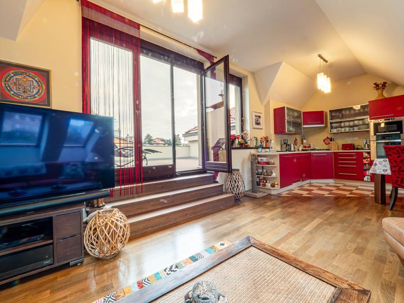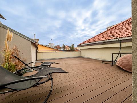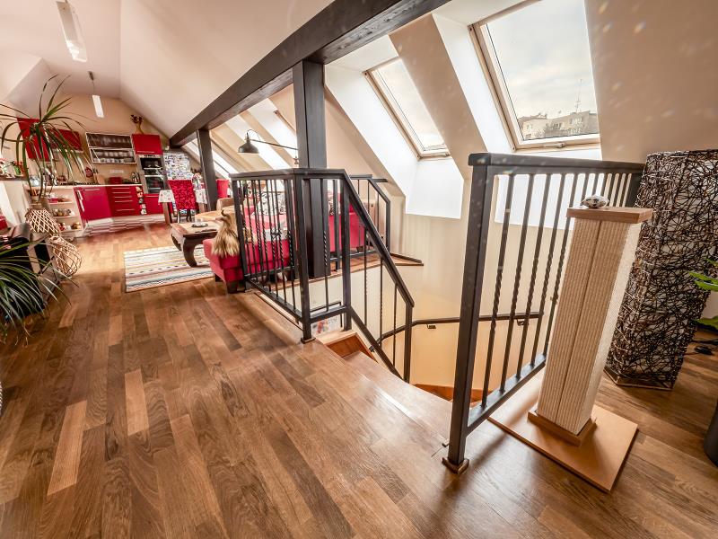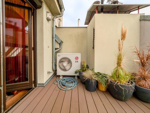 Altoja Living reality Vám nabízí k prodeji krásný mezonetový byt 4 + k.k. s velkou terasou bez sousedů v Praze 4 - Podolí, ul. Doudova. Mezonetový byt o rozloze 125 m² se nachází ve 3. a 4. p. domu bez výtahu. Z obývacího pokoje je přístup na terasu o rozloze 39 m², která je orientovaná do klidného vnitrobloku. Celková užitná plocha bytu je tedy 164 m². V místnostech je dřevěná podlaha, u kuchyňské linky je dlažba. V bytě je koupelna a dvě samostatná WC. Orientace obývacího pokoje s k.k. je S+J, ložnice jsou na S. V bytě je klimatizace, internetové připojení optickým kabelem a v předsíni velká vestavěná skříň. Topení zajištěno plynovým kotlem Protherm. K bytu náleží 2 komory a sklep. Kolaudace bytu byla v roce 2008. Metro Pražského povstání je dvě stanice autobusem, tramvaj je 5 minut chůzí. Výjimečná poloha domu umožňuje příjemnou procházku ke vchodu do areálu Vyšehradu (600 m), do parku Kavčí Hory, nebo na Branické skály. V docházkové vzdálenosti se nachází Plavecký areál Podolí a Žluté lázně. Cyklostezka přes Zbraslav až do Vraného nad Vltavou (délka 15 km) je vzdálena od domu 500 metrů. Další dostupná cyklostezka vede do Prokopského údolí. Oblíbené farmářské trhy Náplavka na břehu Vltavy jsou cca1 km od domu. Byt bude k nastěhování v červenci 2026.
