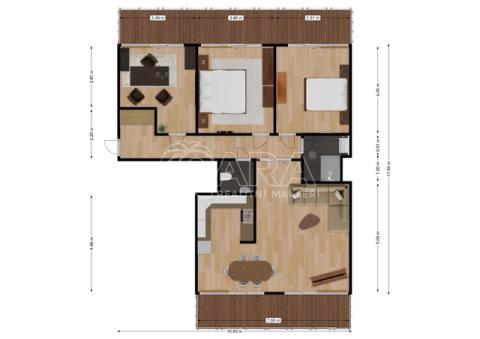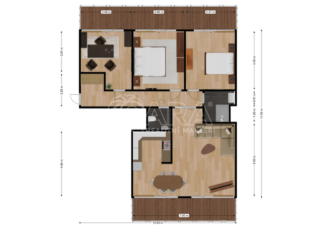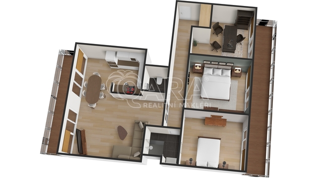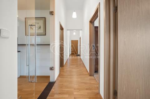 Tento prostorný byt situovaný ve 3. patře moderního domu, nabízí velkorysých 93,5m2. Je ideálně navržen pro rodinný život s důrazem na soukromí. Srdcem domova je otevřený a světlý obývací pokoj s kuchyňským koutem, který je perfektní pro společné chvíle a reprezentaci. Díky odděleným pokojům pro děti a rodiče, naleznete klid a komfort pro všechny. Velkou přidanou hodnotou jsou dva samostatné balkony, přístupné z hlavních místností. Ty Vám umožní vypít ranní kávu nebo relaxovat s pohledem na okolní přírodu. Samozřejmostí je k bytu také garážové místo a sklep pro ukládání věcí. Tento byt je připraven stát se Vaším novým domovem, který splňuje ty nejvyšší nároky na kvalitu a provedení.