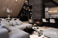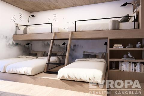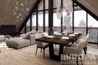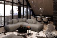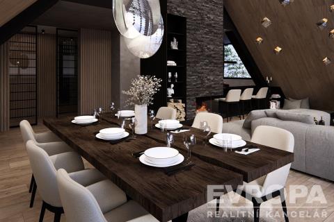 Dispozice zahrnuje velkorysý obývací prostor s vysokými stropy, tři samostatné ložnice, tři koupelny s toaletami, šatnu a privátní saunu s unikátním výhledem na sjezdovky. Z obývacího pokoje se otevírá působivé panorama Krkonoše, které podtrhuje jedinečnost celé nemovitosti. Atmosféru hor umocní také klasický krb, jenž se stane dominantou obytného prostoru.