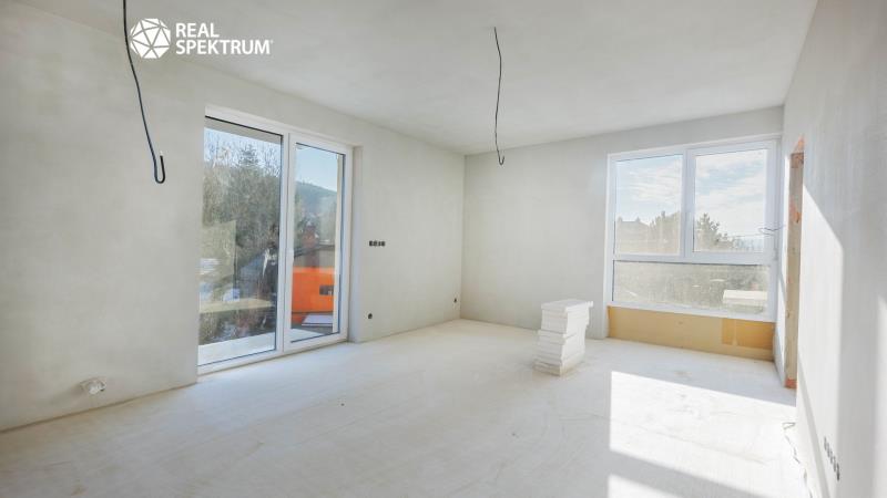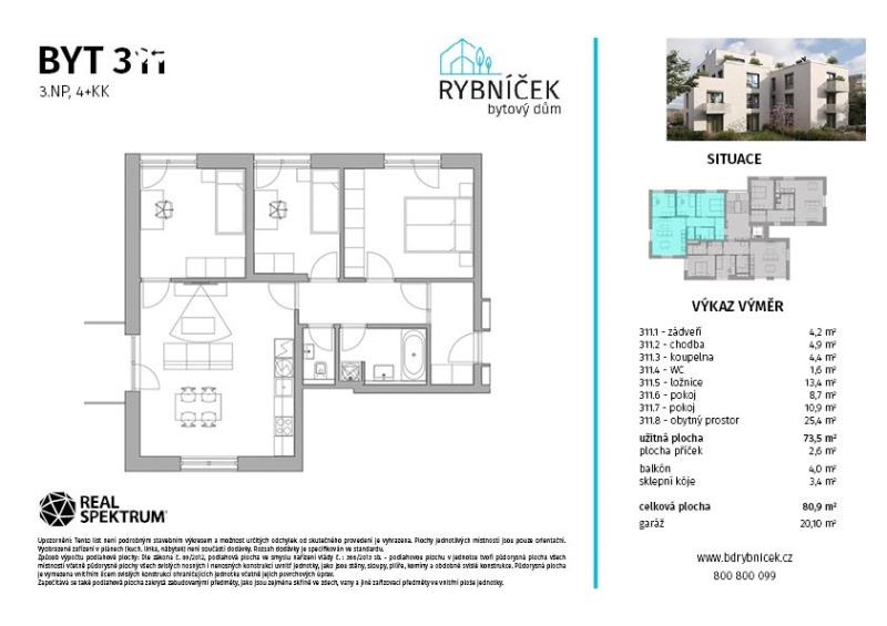 Dispozice: zádveří (4,2 m²), chodba (4,9 m²), pokoj s kuchyňským koutem (25,4 m²), pokoj (13,4 m²), pokoj (10,9 m²), pokoj (8,7 m²), koupelna (4,4 m²), WC (1,6 m²), balkon (4,0 m²), sklepní kóje (3,4 m²), garáž (20,1 m²)