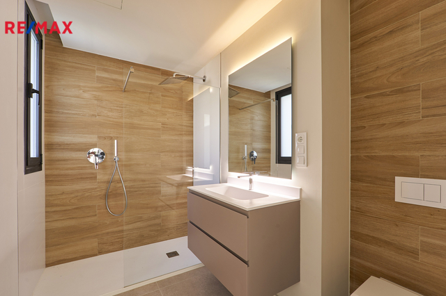 Interiér je proveden ve vysokém standardu s důrazem na kvalitní materiály a nadčasový design. Podlahy tvoří leštěná porcelánová dlažba Marazzi v odstínu Work Grey, použitá v interiéru i na terase v protiskluzové úpravě. Kuchyň je vybavena vestavnými spotřebiči značky Balay. Koupelny disponují sanitou Duravit Neo, umyvadly Mineralmarmo, bateriemi TRESS Class a sprchovými kouty s obklady v dekoru dřeva. Samozřejmostí jsou hliníková okna a posuvné dveře s výbornou tepelnou i akustickou izolací, bezpečnostní vstupní dveře a vestavěné skříně.