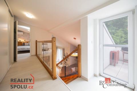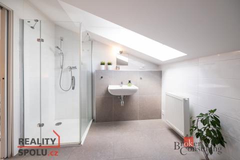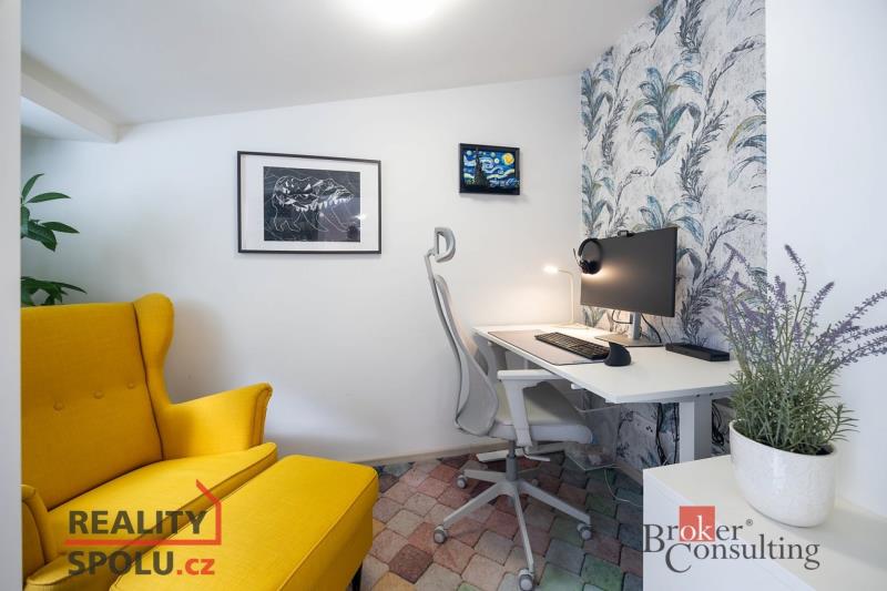 Moderní a tichý mezonetový byt 4kk v Hrdlořezích Vám nabídne vše, co potřebujete: stylové bydlení ve dvou nejvyšších patrech nového bytového domu, komfortní parkování na dvorku za domem, sklep a dvě krásné terasy s maximálním soukromím. Jedná se o promyšleně řešený byt s 2 ložnicemi, pracovnou a velkorysým obývacím pokojem s velkou kuchyňskou linkou. Součástí bytu jsou i dvě koupelny (na každém patře jedna). Výhodou bytu je i orientace do absolutní zeleně, díky které získáte každodenní pocit klidu a relaxace. Byt je i přes svojí polohu blízko komunikace nevídaně tichý. To je způsobeno dobrým konstrukčním řešením domu a kvalitou všech užitých stavebních prvků. Byt vám tím nabízí jedinečnou kombinaci tichého soukromí a výborné dopravní dostupnosti. Bytová jednotka je osazena rekuperací a klimatizací. Obojí zvyšuje už tak vysoký komfort bytu. Čistý vzduch a příjemné klima vám bude zvyšovat kvalitu bydlení ve všech ročních obdobích. Užitná plocha bytu je 93,3 m2. K bytu patří dvě terasy o výměrách 3,7 m2 a 6,7 m2 a sklep v podzemním podlaží. Na první patře bytu najdete prostorný obývací pokoj s kuchyňským koutem, koupelnou a dětským pokojem. Po schodech z obývacího pokoje se pak dostanete do horního patra, kde nejdříve uvidíte pracovnu. Po krátké galerii s dobře řešenými vestavěnými skříněmi se dostanete do ložnice a za ní pak do další koupelny se záchodem. V horním patře se také nachází i krásná terasa. Za zmínku jistě stojí i kvalitní vinilové podlahy, které jsou položeny v obou patrech. Nový majitel získá nejenom byt, ale i podstatnou část jeho vybavení: praktické vestavěné skříně, krásnou kuchyňskou linku a schody z masivu s příjemným LED osvětlením. Dům je nový (zkolaudovaný v roce 2018), komorní (pouze 8 bytů), má prostorný výtah, centrální plynový kotel a soukromé parkoviště na vnitřním dvorku za domem. Parkoviště je zabezpečeno automatickými vraty. Cena parkovacího stání stojí 600.000 CZK. Byt se nachází v lokalitě s výborným spojením do centra – autobusová zastávka je pouhých 180 m od domu, za necelých 10 minut se dostanete na stanice metra Palmovka nebo Vysočanská a tramvajová zastávka Spojovací je vzdálena jen 10 minut chůze. V docházkové vzdálenosti najdete hned několik supermarketů – Lidl, Kaufland i Albert. Milovníci přírody ocení blízkost přírodního parku Smetanka, který nabízí klidné procházky podél meandrů říčky Rokytky. Park je navíc napojen na oblíbenou cyklostezku, která vás zavede až do Troji – ideální pro víkendové výlety na kole nebo pěšky.