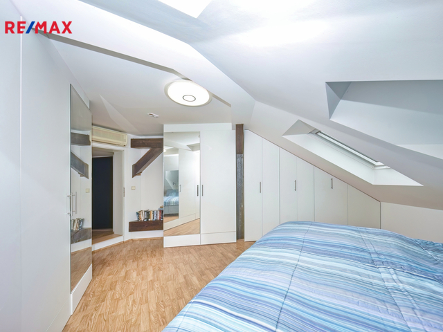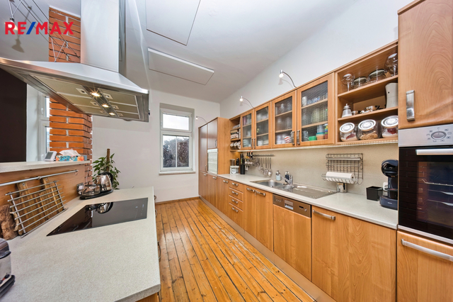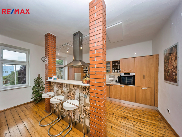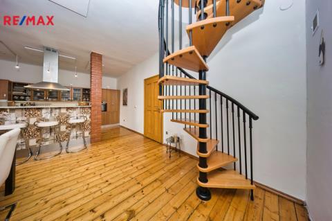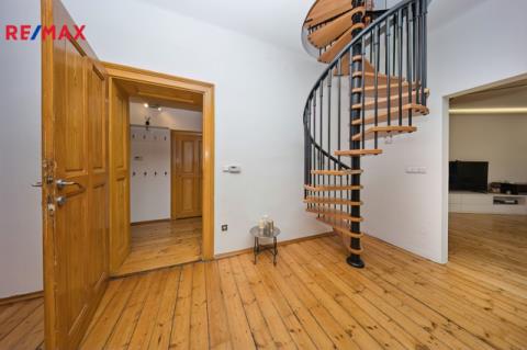 Nabízíme k prodeji mezonetový byt 5+1 s krytým parkovacím stáním, zahradou ve společném užívání (s vyhrazeným soukromým prostorem), terasou a sklepem v osobním vlastnictví o celkové evidované podlahové ploše 189 m². Byt se nachází ve 2. a 3. nadzemním podlaží (z celkem 3 NP) cihlového domu z roku 1919 bez výtahu.