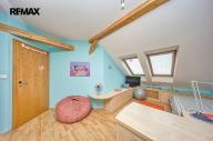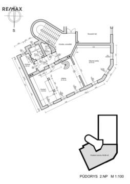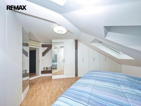 Ve 2. NP se nachází prostorný obývací pokoj s krbem (30,75 m²) plynule navazující na jídelnu (25,19 m²) a kuchyň (13,32 m²). Dále zde najdete předsíň/halu (6 m²), komoru (4,59 m²), koupelnu s vanou (3,97 m²) a samostatné WC (2 m²). Do 3. NP (podkroví) vede točité schodiště umístěné v jídelně, nebo lze využít i vstup z chodby v 3. NP bytového domu. V podkroví se nachází tři samostatné pokoje (27,55 m², 20,7 m², 16,52 m²), koupelna se sprchou a WC (5 m²), komora (2,26 m²), šatna (1,82 m²) a předsíň s výstupem na terasu (7,55 m²) v hrubém provedení.