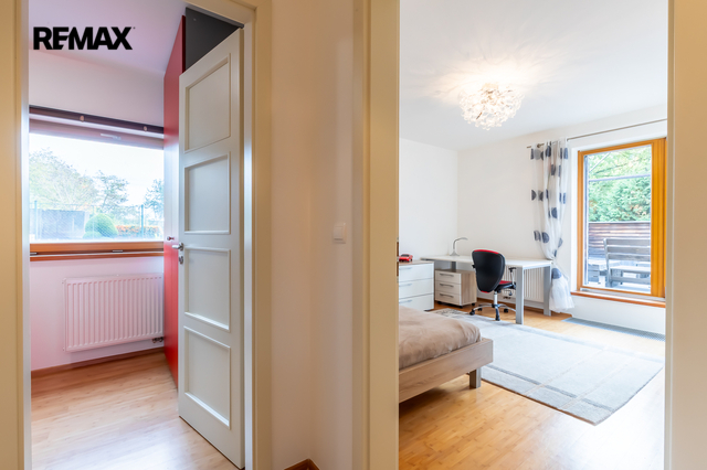 Horní patro je rozděleno na dětskou a rodičovskou část. Každá z nich je oddělena chodbou a má vlastní koupelnu, šatnu i terasu, což zajišťuje maximální soukromí pro všechny členy rodiny. Hned u vstupu do domu se nachází praktická šatna.