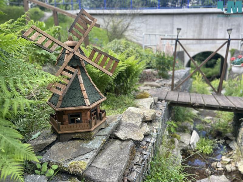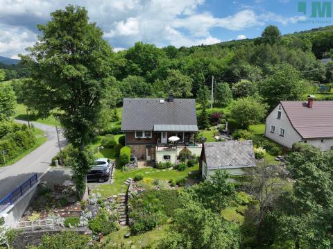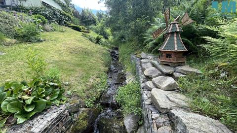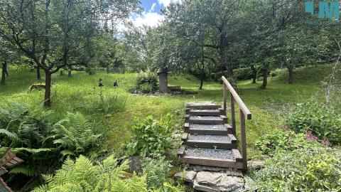 Pozemek je situován v mírném svahu a zahrada je rozdělena do několika funkčních a estetických částí. Zahradou protéká potok s kaskádami, přes který vede dřevěný mostek do švestkového sadu. Navazují terasy se zpevněním z gabionů a suchých zídek, slunná relaxační zóna s možností umístění bazénu a jídelní posezení v soukromí živého plotu. Součástí zahrady je vyvýšený dětský domek, dřevník a kůlna, původně sloužící jako včelín, a pečlivě udržovaná okrasná i užitková výsadba zahrnující lupiny, japonský javor, hortenzie, okrasné traviny, borůvky, jabloně, višně, švestky a zeleninové záhony, přičemž údržba zahrady je časově nenáročná.