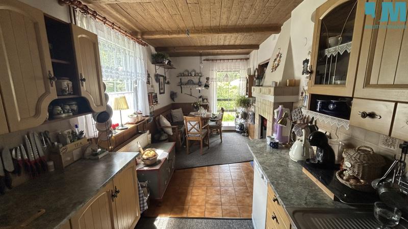Vstup do domu vede přes zastřešenou terasu orientovanou na jih, která je ideálním místem pro venkovní posezení. V přízemí se nachází vstupní chodba, kuchyně ve vintage stylu s jídelním koutem a zabudovanými kamny, velká koupelna s vanou, toaletou, umyvadlem a pračkou, praktická komora pod schody s dostatkem úložného prostoru a obývací pokoj se schodištěm do horního patra. V patře je chodba se vstupem na půdu, dětský pokoj a ložnice s manželskou postelí. Dům je částečně podsklepený a sklep aktuálně slouží k uskladnění zeleniny a dřeva.