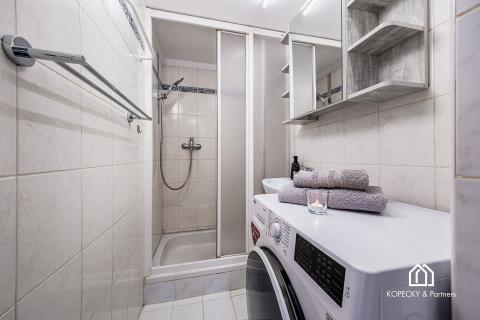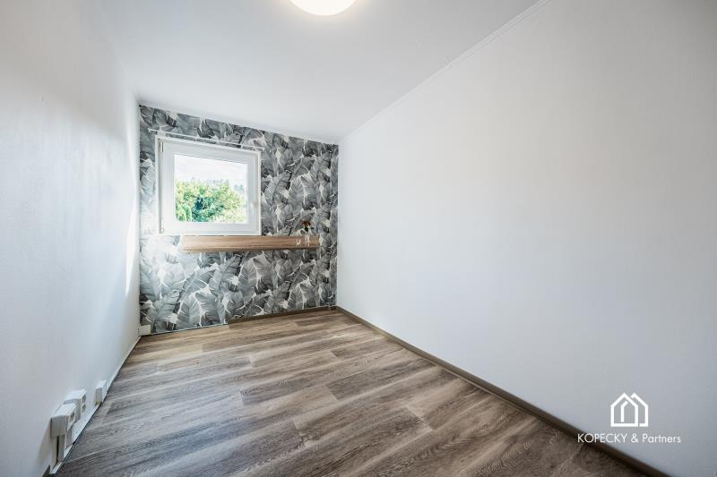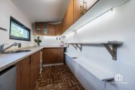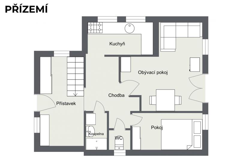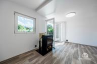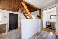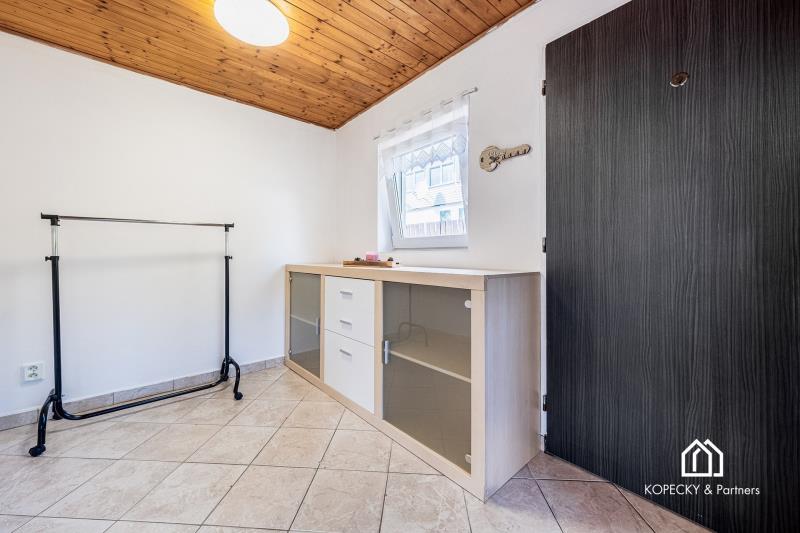 Kuchyň je prakticky propojena s obytným prostorem a působí svěže a funkčně. V podkroví se nachází ložnice s dostatkem úložného prostoru, kterou lze využít i jako pracovnu nebo dětský pokoj. V suterénu je sklep a k dispozici je i kůlna pro uskladnění nářadí. Na pozemku je vybudováno parkovací stání a vjezd na pozemek zajišťuje elektrická brána s dálkovým ovládáním, což podtrhuje komfort i bezpečnost celého objektu.
