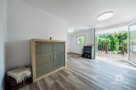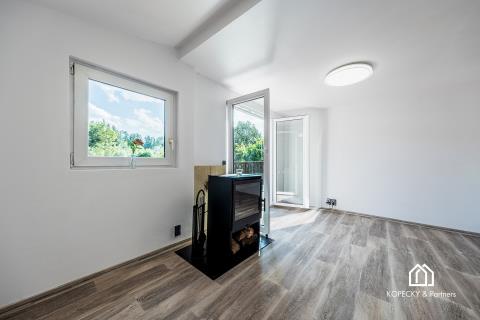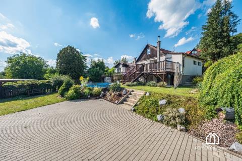 V přízemí se nachází prostorný obývací pokoj s krbovými kamny, které vytvářejí útulnou atmosféru a zároveň zajišťují efektivní vytápění celého domu. Z obývací části se vstupuje přímo na velkou terasu s výhledem do krajiny, ideální pro ranní kávu, večerní posezení i letní grilování. Na terasu navazuje udržovaná zahrada s dostatkem prostoru pro odpočinek i bazén, který je součástí pozemku.