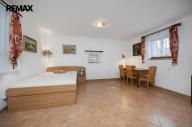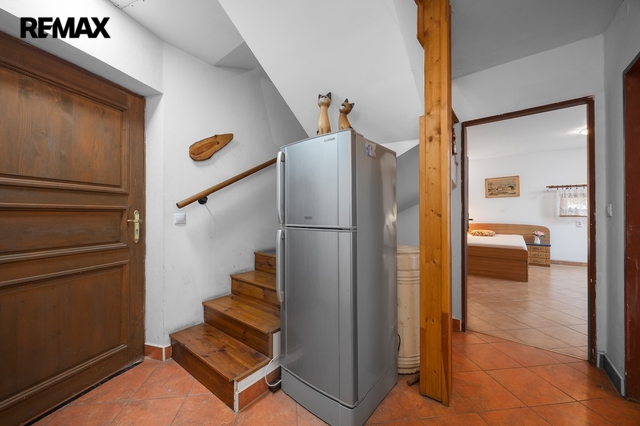 V přízemí se nacházejí dvě prostorné místnosti, které tvoří srdce celé chalupy. Hlavní obytný prostor, tradiční světnice, slouží jako místo pro vaření, stolování i odpočinek. Dominantou této místnosti jsou stylová kachlová kamna, ve kterých je možné nejen topit, ale i vařit nebo péct, což podtrhuje autentickou venkovskou atmosféru. Druhá místnost v přízemí je využívána jako ložnice s pracovním koutem, vytápěná klasickými kamny, a nabízí příjemné zázemí pro spaní i klidnou práci.