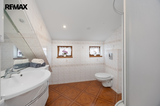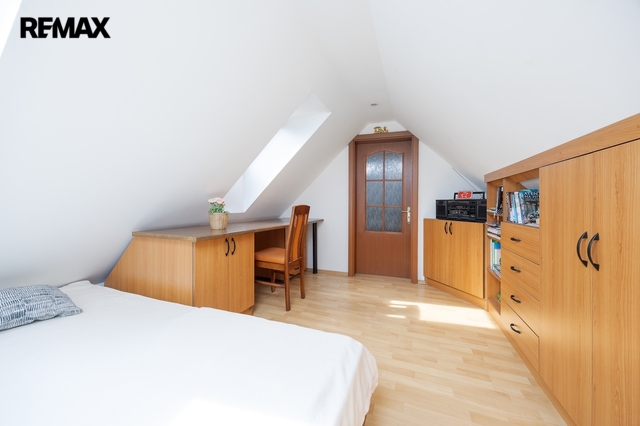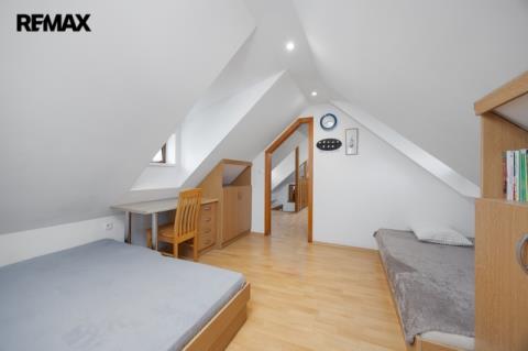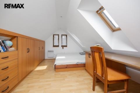 V podkroví se nacházejí další dva pokoje. Jeden z pokojů je vytápěn přímotopem, druhý je bez vlastního zdroje vytápění. Na chodbě v podkroví je navíc příjemné posezení, které vytváří další prostor pro relaxaci. Komfort užívání zvyšuje skutečnost, že jak v přízemí, tak i v podkroví je k dispozici koupelna se sprchovým koutem a toaletou.