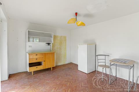 Zahradní domek (cca 3,5 × 4 m) má zděný sklep a obytné patro s terasou. Sklep je suchý a chladný, vhodný k uskladnění ovoce nebo nářadí. Vstup do obytné části vede po strmějším schodišti s železnou konstrukcí a dřevěnými schodnicemi na terasu s ocelovým zábradlím. Místnost působí světlým dojmem díky oknům na jih a na východ. Střecha má vysoký krov, kam by se vešla další vestavba.