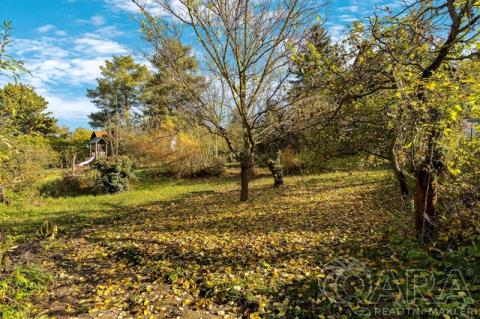 Zahrada je orientovaná na jih, mírně svažitá, s několika vyrovnanými místy vhodnými pro posezení se slunečníkem nebo bazének. Na hranici pozemku rostou ovocné stromy, především jabloně, a podél plotu vinná réva a ostružiny. Ze zahrady je příjemný výhled na protilehlý svah a přilehlou loučku, na které je nově vybudované dětské hřiště.