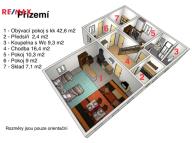 Přízemí: zádveří, obývací pokoj s kuchyňským koutem (2+kk), koupelna s WC, samostatný pokoj, veranda, sklep, vstup na zahradu.
