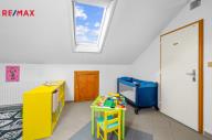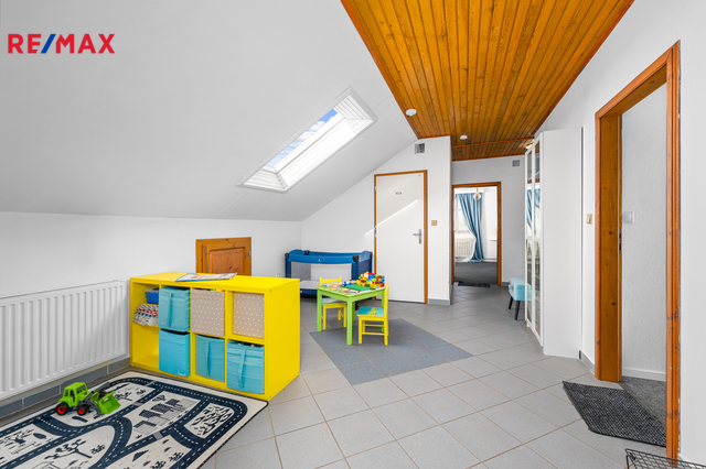 Tyto prostory propojuje společná místnost, která je v tuto chvíli zaměřená na dětské aktivity - postýlka, přebalovací pult, hračky, knihovna a je zde i menší úložný prostor - komora.