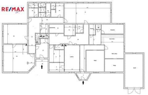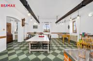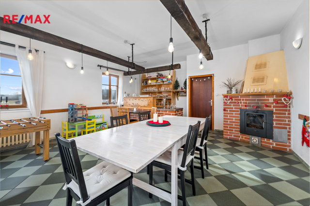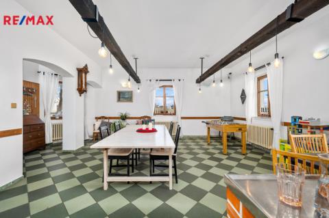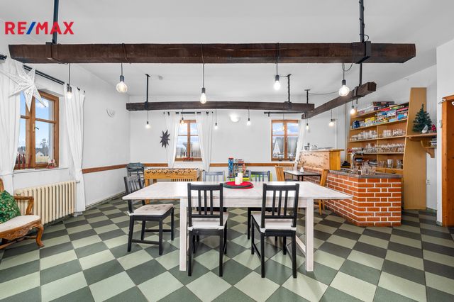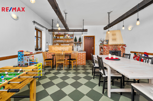 V přízemí, vedle hlavního vchodu se nachází společenská místnost, která dříve sloužila jako restaurace. Některé původní prvky tohoto využití zde byly zachovány a tak je možné takový provoz obnovit či využít k různým společenským akcím a teambuildingům. Dominantou této místnosti je krb, který v chladnějších měsících navozuje jak teplo, tak příjemnou atmosféru. K dobré obslužnosti napomáhá menší, částečně vybavená kuchyň, která na tuto místnost navazuje.