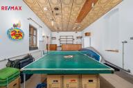 Dále jsou v přízemí oddělené toalety a další společenská místnost - klubovna, kde je dominantou velký pingpongový stůl a vstup na rozlehlou venkovní terasu, kde je dostatek prostoru pro společenské posezení či relax.