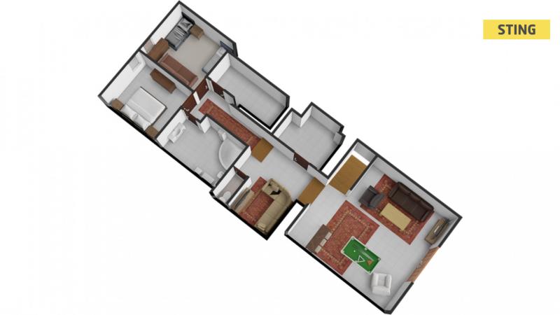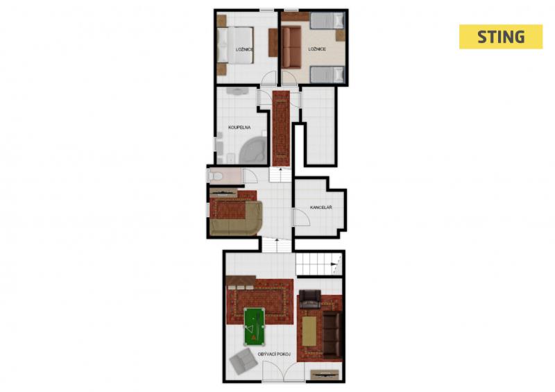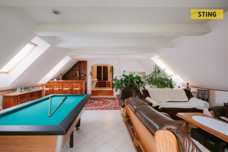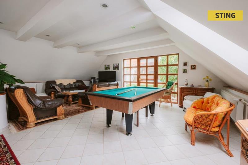 Ve druhém patře se rozprostírá společenská místnost s kulečníkem, barem a přímým vstupem na zahradu s bazénem a zahradním domem, dále čítárna, pracovna, dvě ložnice, šatna a koupelna s rohovou vanou. Dům má také půdu, ideální pro uložení sezónních věcí.