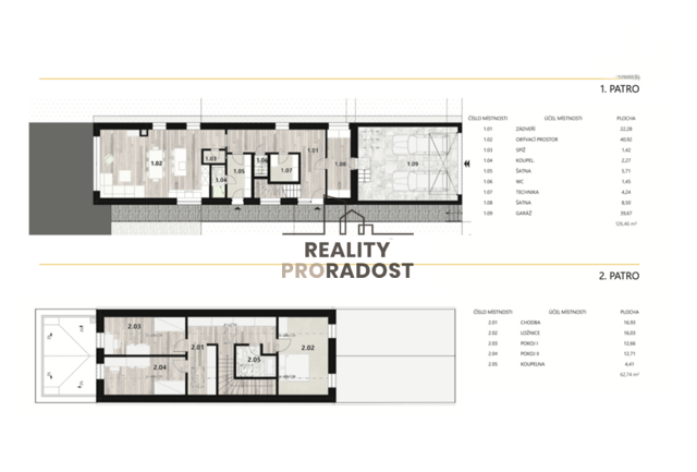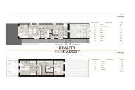 Vnitřní dispozice: 1. NP (přízemí): zádveří, obývací prostor s jídelnou a kuchyňským koutem, spíž, koupelna, šatna, technická místnost, toaleta, skladovací prostor, garáž 2. NP (obytné podkroví): chodba, 2x pokoj, ložnice s toaletou a koupelnou.