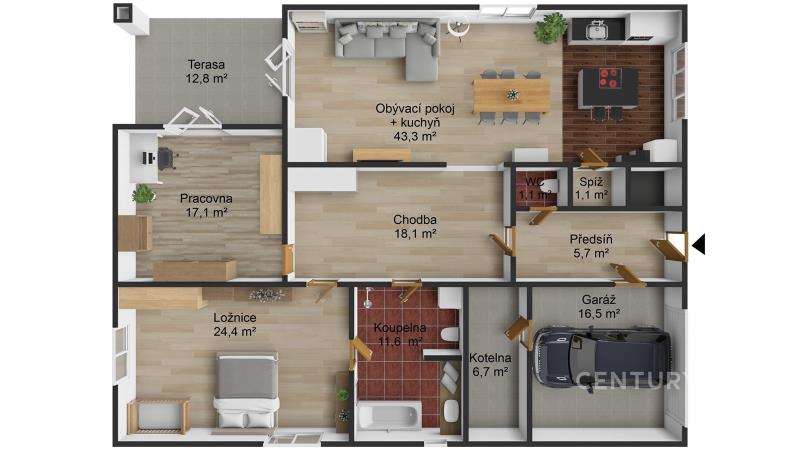 Už při vstupu vás přivítá promyšlená dispozice, která nabízí dostatek místa pro každodenní život i společné chvíle. Obývací prostor s krbovými kamny se stane přirozeným centrem domova – místem, kde se scházíte, povídáte si a trávíte večery.