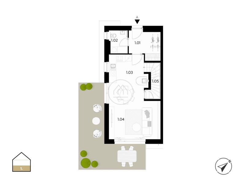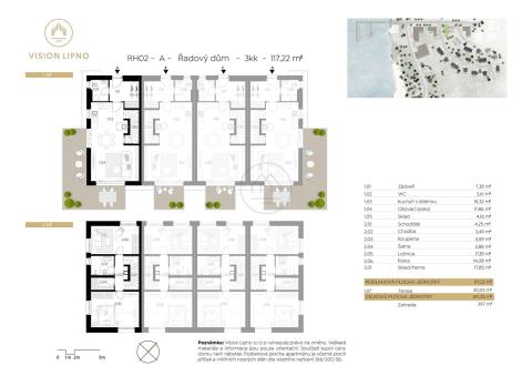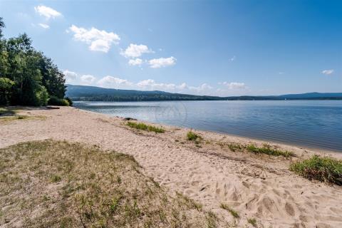 Krajní jednotka o dispozici 3+kk s podlahovou plochou 117 m² je součástí řadového domu a nabízí moderní zázemí k rekreaci pro Vaši rodinu i budoucí hosty. Přízemí vítá prostorným zádveřím a samostatným WC. Následuje velký obývací pokoj s kuchyní, jídelnou a vstupem na krásnou terasu a zahradu s výhledem na vodní hladinu Lipna. V podkroví se nachází dva pokoje, koupelna a v dalším podlaží skladovací prostory.