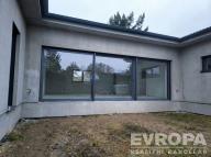 Okna: 7m široký hliníkový HS portál propojující obývák se zahradou. Izolační trojskla s předsazenou montáží pro nulové tepelné mosty. Všechna okna jsou již osazena elektricky ovládanými venkovními žaluziemi.