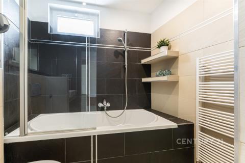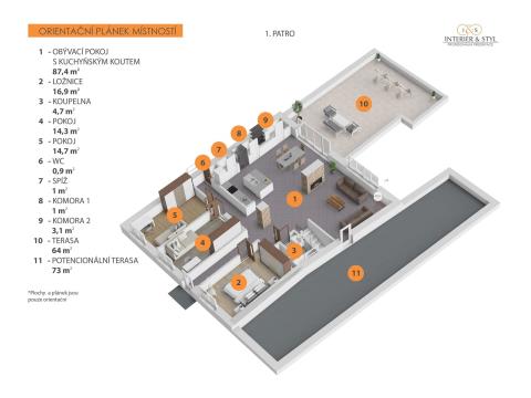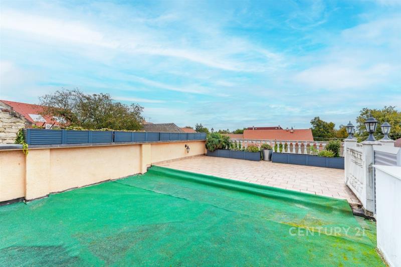 Z obytné části se vychází na dvě terasy, které přirozeně propojují interiér s exteriérem. Jednu z nich je možné upravit nebo přestavět na zimní zahradu – ideální místo pro celoroční odpočinek. Horní patro je navíc stavebně připravené i pro samostatný vstup na zadní zahradu, což umožňuje v budoucnu oddělit prostor pro vícegenerační bydlení nebo pronájem.