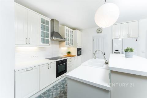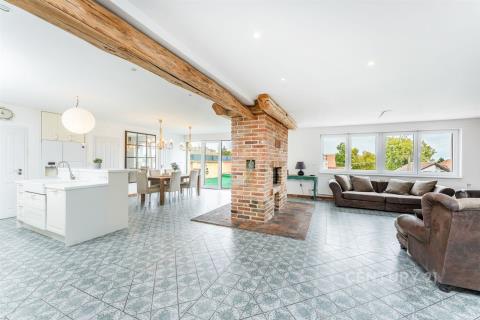 Dominantou interiéru je velký otevřený prostor obývacího pokoje, kuchyně a jídelny s centrálním krbem, který prostoru dodává jedinečnou atmosféru. Právě tady si lze představit klidné večery s rodinou nebo přáteli u praskajícího ohně.