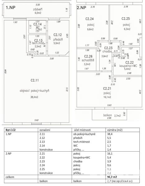 2. NP: V patře se nachází tři samostatné ložnice (16 m², 9,6 m², 9,3 m²) a koupelna. Hlavní ložnice nabízí dostatek prostoru. Z hlavní ložnice je vstup na balkon (2,7 m²) s krásným výhledem do údolí a do města.