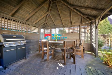 V přízemí se nachází vstupní chodba s úložným prostorem, prostorná ložnice a technická místnost s elektrickým kotlem. Dominantou přízemí je propojený obývací pokoj s kuchyní. Kuchyňská linka ve tvaru písmene L je moderní a vybavená vestavěnými spotřebiči – elektrickou troubou, mikrovlnnou troubou, indukční deskou, myčkou a dostatkem úložných prostor. Tento společný prostor působí velmi vzdušně a útulně díky vyšším klenutým stropům. Z kuchyně je přímý vstup do prostorné koupelny s masážní vanou, toaletou a místem pro pračku i sušičku. Z chodby za kuchyní se vychází na zahradu, která nabízí naprosté soukromí, altán a upravený trávník.
