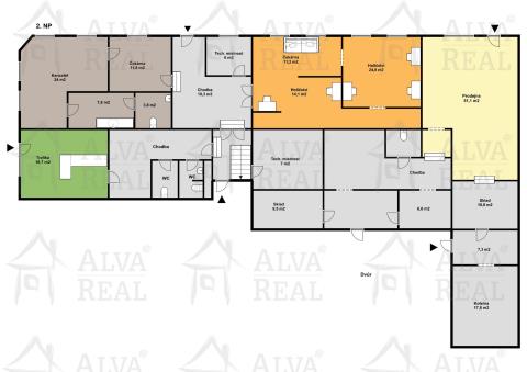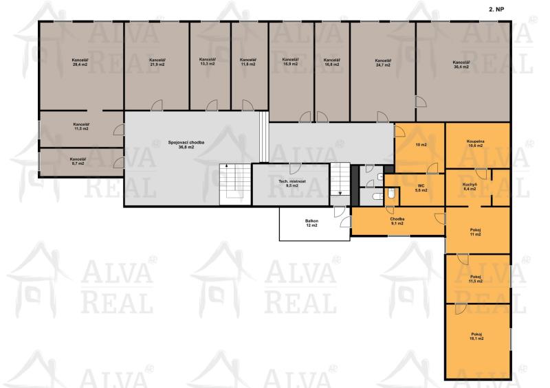 2.NP: jiné nebytové prostory 250 m2: tyto prostory jsou z větší části nepronajaty, kromě jedné místnosti, ve které se v tomto okamžiku nachází nehtové studio. Dříve sloužily tyto prostory jako kanceláře, po přestavbě a rekolaudaci, by bylo tyto prostory možno využít k bydlení.