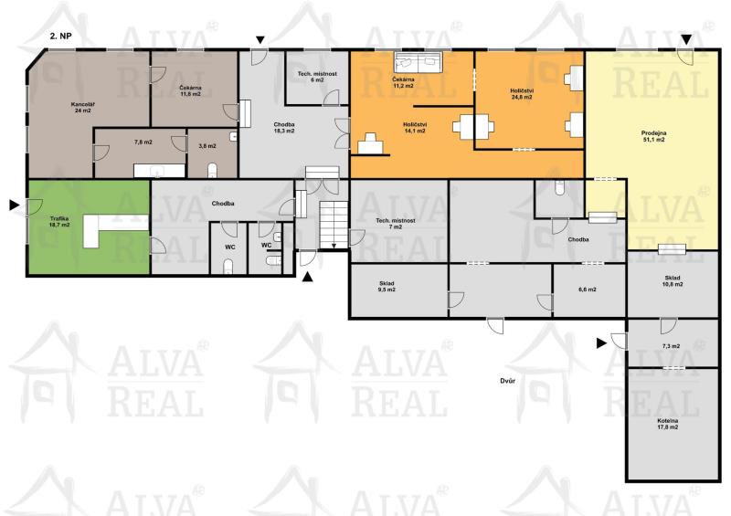 1. NP: dílna nebo provozovna: tyto prostory jsou dlouhodobě pronajaty a nachází se v nich pobočka pojišťovny, trafika, holičství a prostor bývalé prodejny (prostor prodejny není v tomto okamžiku pronajaty z důvodu přestavby). Pobočka pojišťovny 47,4 m2, tyto prostory prošly v minulém roce kompletní vnitřní rekonstrukcí (čekárna 11,8 m2, kancelář 24,0 m2, kuchyňka 7,8 m2, technická místnost + WC 3,8 m2), trafika 18,7 m2, holičství 63,1 m2 (technická místnost 6,0 m2, čekárna 11,2 m2, provozovna 14,1 m2 + 24,8 m2, technická místnost 7,0 m2), prodejna 61,9 m2 (prostor prodejny 51,1 m2, sklad 10,8 m2) kotelna 17,8 m2. V tomto NP se nachází další prostory, které nemají v tomto okamžiku žádné využití.