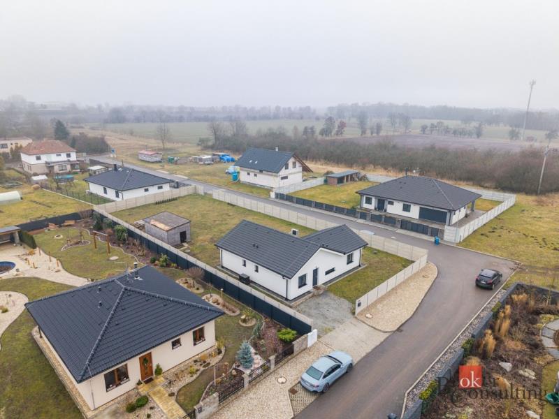 Moderní novostavba rodinného domu s velkou zahradou Nabízíme k prodeji moderní novostavbu rodinného bungalovu v klidné obci Sovinky, na ulici Nad Vinicí. Dům s užitnou plochou 104 m² se nachází na prostorném pozemku o velikosti 1 210 m², který poskytuje dostatek soukromí, prostoru pro rodinný život i relaxaci na zahradě. Dominantou domu je obytný prostor s přímým vstupem na terasu a zahradu díky velkým proskleným dveřím. Dispozice domu nabízí tři samostatné ložnice, koupelnu, samostatnou toaletu a praktickou technickou místnost pro pračku a sušičku. Z hlavní ložnice je navíc vstup do samostatného velkého šatníku s vestavěnými skříněmi. Součástí domu je také částečně pochozí podkroví o velikosti přibližně 15 m², které slouží jako praktický úložný prostor. Dům je vybaven moderními technologiemi pro komfortní a úsporné bydlení. Podlahové vytápění napojené na tepelné čerpadlo spolu s klimatizací a venkovními žaluziemi zajišťuje příjemné klima v interiéru po celý rok i dostatek soukromí. Klimatizaci je navíc možné pohodlně ovládat také prostřednictvím mobilního telefonu. Na zahradě se nachází také retenční nádrž na dešťovou vodu, do které je svedena voda z okapů a kterou lze využít například pro zalévání zahrady. Velkou výhodou je také okolní příroda. Z domu se lze napojit přímo na cyklostezku a v blízkosti se nachází les, který nabízí ideální možnosti pro procházky, sport i relaxaci. Obec Sovinky nabízí dobrou dostupnost do okolních měst. Mateřská i základní škola se nachází v nedalekém Beznu, přibližně 10 minut pěšky od domu. V obci je také večerka a další občanská vybavenost včetně potravin, pošty a bistra v Beznu. Velkou výhodou je také dopravní dostupnost, do centra Mladé Boleslavi se dostanete přibližně za 10 minut a do Prahy zhruba za 28 minut jízdy autem. Tato moderní novostavba je ideální volbou pro ty, kteří hledají klidné rodinné bydlení s velkým pozemkem, moderními technologiemi a výbornou dostupností do města i do Prahy. Rád Vás tímto domem provedu osobně a ukážu Vám vše, co z něj dělá výjimečné místo k bydlení.