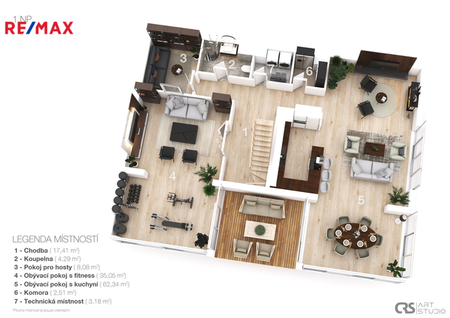 Vedle obývací části se nachází další prostorný pokoj, který současní majitelé využívají jako tělocvičnu, a za ním pokoj pro hosty. V přízemí je dále k dispozici koupelna, prádelna a technické zázemí, kde jsou umístěny mrazáky, lednice a úložné prostory pro suché potraviny. Díky tomu zůstává kuchyň čistá a otevřená, zatímco vše potřebné máte jen pár kroků vedle.