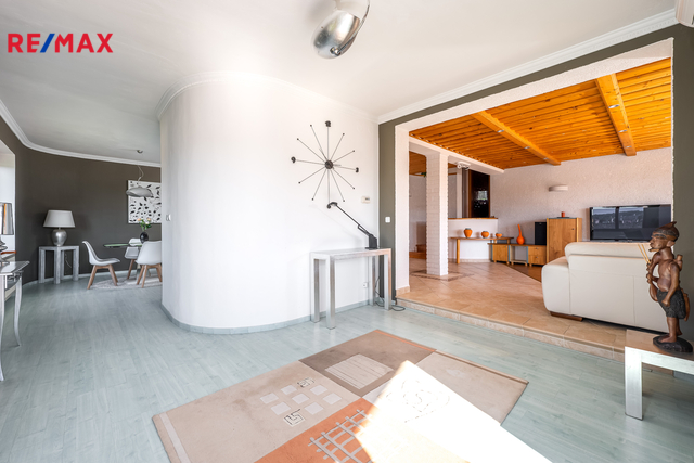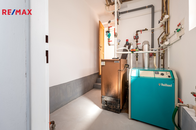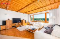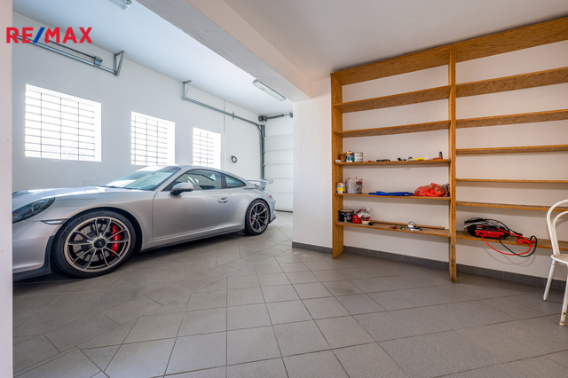 Dispozice domu: obytné podkroví, 1 ložnice,2 hostinské pokoje, 1 dětský pokoj s koupelnou a WC. 1 NP má 2 mimoúrovňové podlahy, kde v mezipatře je ložnice, samostatné WC a koupelna. Obývací pokoj/40m2/ je propojený s jídelnou a kuchyní. Kuchyňská linka je kompletně osazena značkovými spotřebiči. Je zde samostatná spižírna. V přízemí je hlavní vstup do domu s halou a chodbou vedoucí na zahradu. Z chodby je samostatný vstup do prádelny, kotelny se zásobárnou dřeva a technické zázemí - 1x garáž pro osobní auto, propojená s velkou garáží pro SUV nebo dodávkový automobil. Z garáže je samostatný vstup do dílny a podzemního kamenného sklepa.