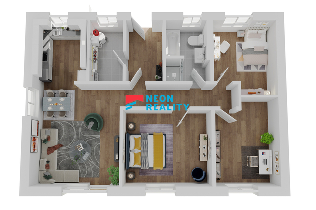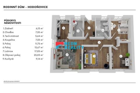 Dům nabízí tři samostatné pokoje, koupelnu s vanou i sprchovým koutem, druhé samostatné WC a technickou místnost. Ve vstupní chodbě je prostor pro vestavěnou skříň.