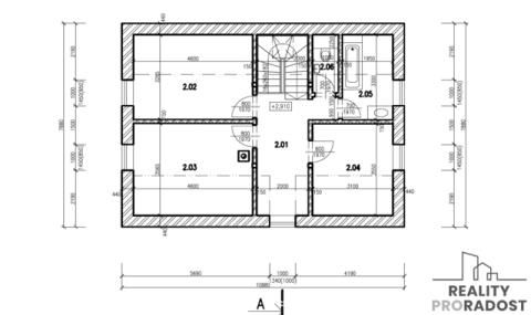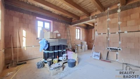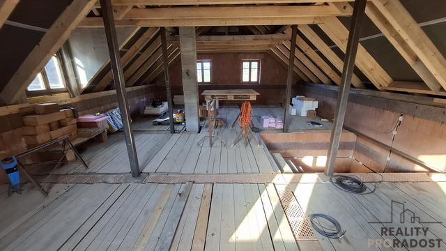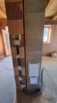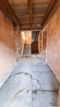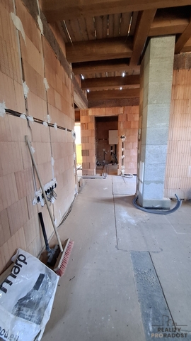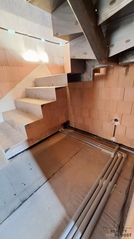 Přízemí je stavebně přesně dle projektu, patro zatím jeden velký prostor a nabízí tak dokončit příčky a pokoje dle vlastního uvážení a potřeb.