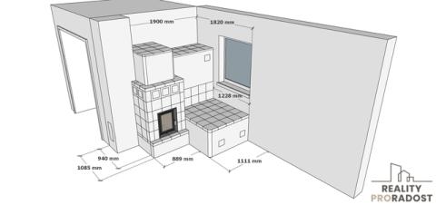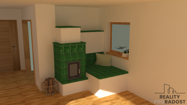 Vytápění: podlahové teplovodní, popř. elektrické; kachlová kamna na míru s teplovzdušným výměníkem(materiál na kachlová kamna k dispozici, uskladněn jinde).