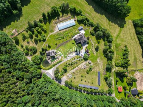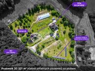 Pozemek o celkové výměře 30 521 m², z čehož cca 18 000 m² tvoří stavební část, zahrnuje kromě hlavní vily také samostatnou garáž s menší dílnou a dům pro hosty. Zastavitelnost parcely činí 50 %, což nabízí výrazný potenciál pro další výstavbu – například realizaci nové etapy rodinných domů či vytvoření ucelené rezidenční kolonie.