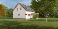 V přízemí domu (61,4 m²) se nachází obývací pokoj propojený s kuchyňským koutem a jídelnou, odkud je přímý vstup na dřevěnou terasu orientovanou do zahrady. Dále je zde samostatný pokoj, koupelna se sprchovým koutem a toaletou, technická místnost, praktická spíž a prostorné zádveří.