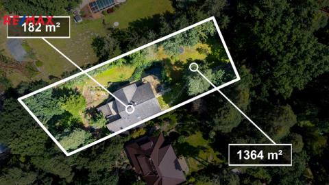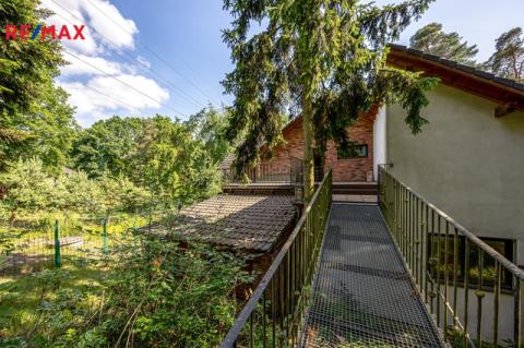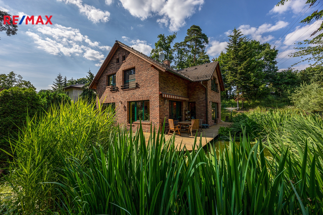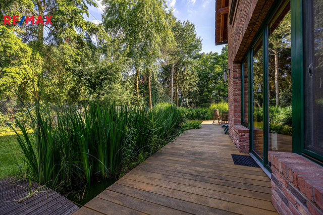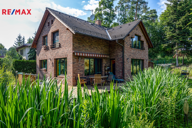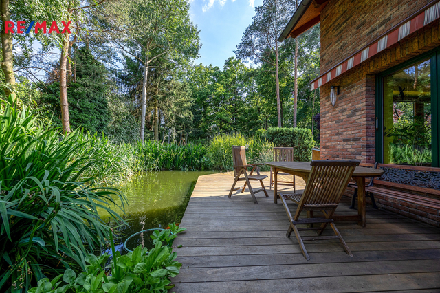 K domu náleží rozsáhlá a pečlivě udržovaná zahrada o výměře 1364 m2, která je vybavena automatickým zavlažovacím systémem napojeným na 50 m³ retenční nádrž, kam jsou svedeny dešťové vody z celé nemovitosti. Na zahradě je umístěno koupací jezírko cca 35 m³ s hloubkou 1,6 m a délkou potoka 15 m, terasy z tropického dřeva IBU s možností zastínění markýzou. Originální kované oplocení, venkovní světla z dílny umělce Rudolfa Burdy.