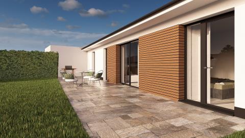 Zahrada s budoucí terasou je přístupná z garáže, z ložnice i z obývacího pokoje.