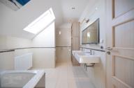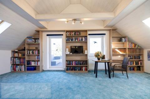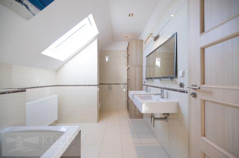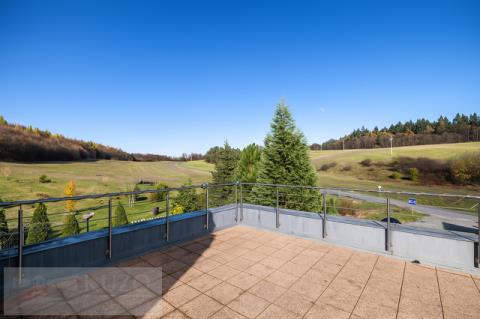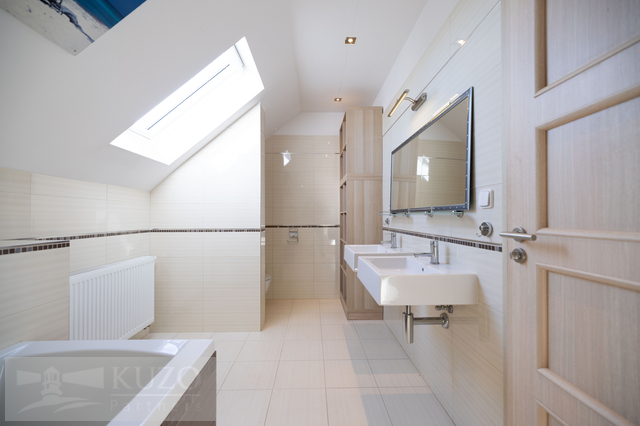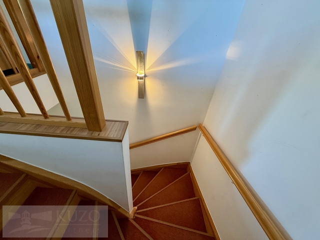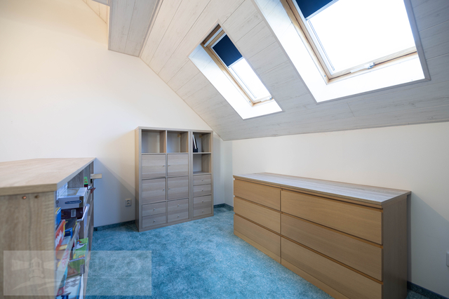 V podkroví ze tří ložnic vznikl jeden členitý otevřený pobytový prostor (57,42m2) se vstupem na terasu 18,04m2, koupelna a WC, lze uvést do původního stavu.