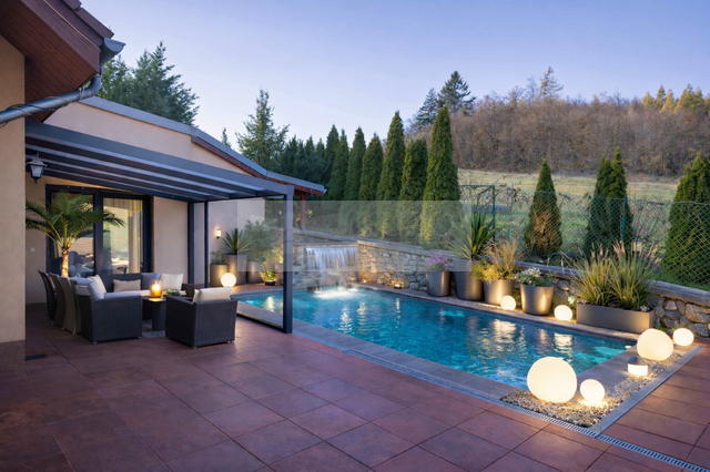 Pozemek o rozloze 449m2 s bazénem nabízí soukromí a prostor pro odpočinek.