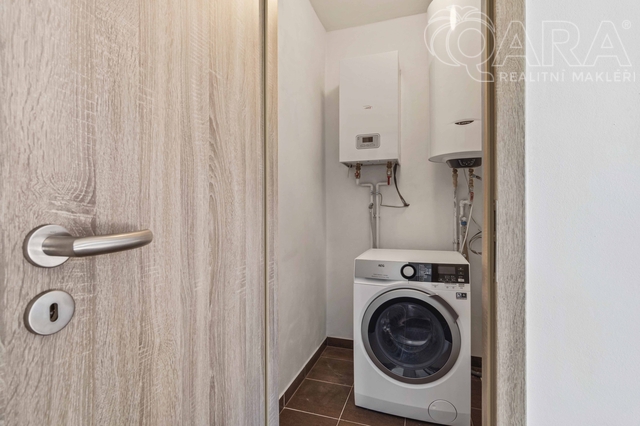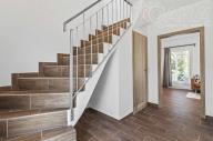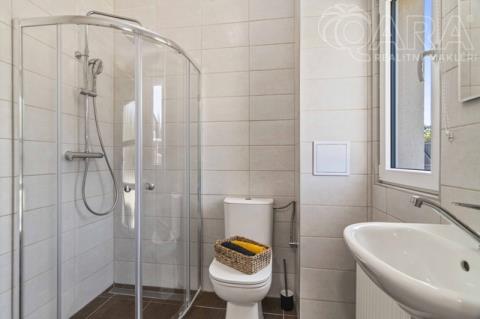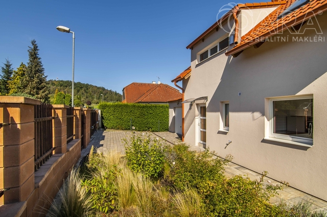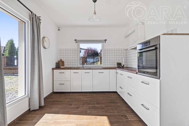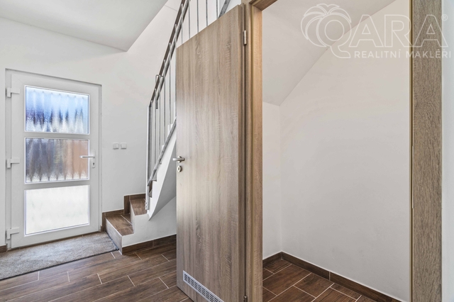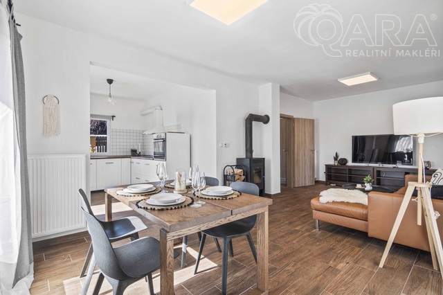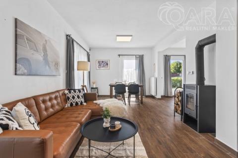 V přízemí se nachází obývací pokoj s krbem a vstupem na terasu, kuchyň s výhledem do ulice, koupelna se sprchovým koutem, technická místnost a spíž (příp. šatna). V patře jsou tři útulné ložnice a koupelna s vanou. Dům je světlý, funkční a působí velmi příjemnou, domáckou atmosférou. Vytápění zajišťuje elektrokotel Protherm (9 kW) doplněný krbovou vložkou, ohřev vody je zajištěn bojlerem zn. Ariston. Dům je energeticky úsporný (PENB – třída C). Na přání lze ponechat vybavení tak, jak jej vidíte na fotografiích (pohovka, postele, skříně apod.). Dům byl obýván jen krátce, vše je tedy ve výborném stavu.