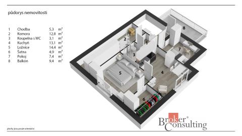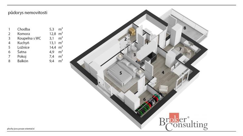 chodba, komora, koupelna s WC, kuchyň, ložnice, šatna, pokoj a balkon