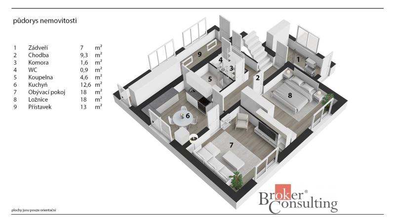 zádveří, chodba, komora, WC, koupelna, kuchyň, obývací pokoj, ložnice a přístavek