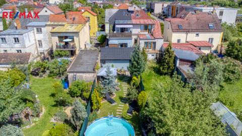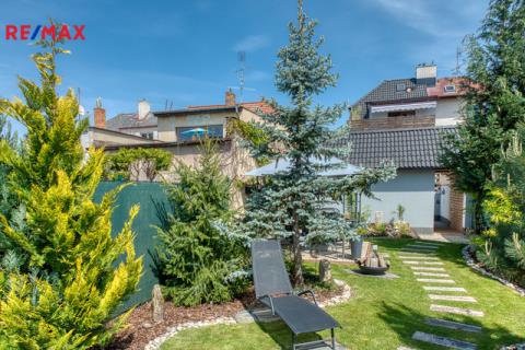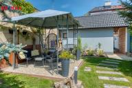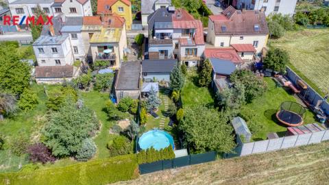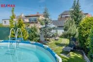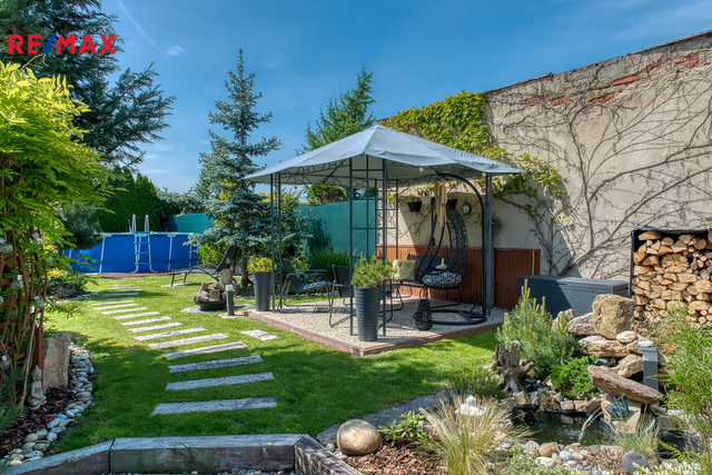 Součástí domu je velmi pěkně udržovaná zahrada s altánkem a nadzemním bazénem, která nabízí dostatek soukromí a prostoru pro rodinnou relaxaci, grilování nebo dětské hry. Zahrada je okrasná, poskytuje příjemné zákoutí i v horkých letních dnech a je ideální pro pěstování květin i drobných plodin.