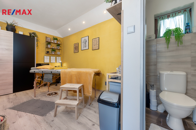 Velkým benefitem této nemovitosti je samostatný zahradní domek, který je zkolaudován pro podnikání a nyní je využíván jako plně funkční masážní salon se sociálním zařízením. Tento prostor je ideální nejen pro masérské nebo kosmetické služby, ale i pro jiné formy podnikání (kancelář, ateliér, obchodní studio, domácí kancelář apod.). Díky oddělenému vstupu si klientelu můžete udržet zcela v soukromí – bez narušení chodu domácnosti.
